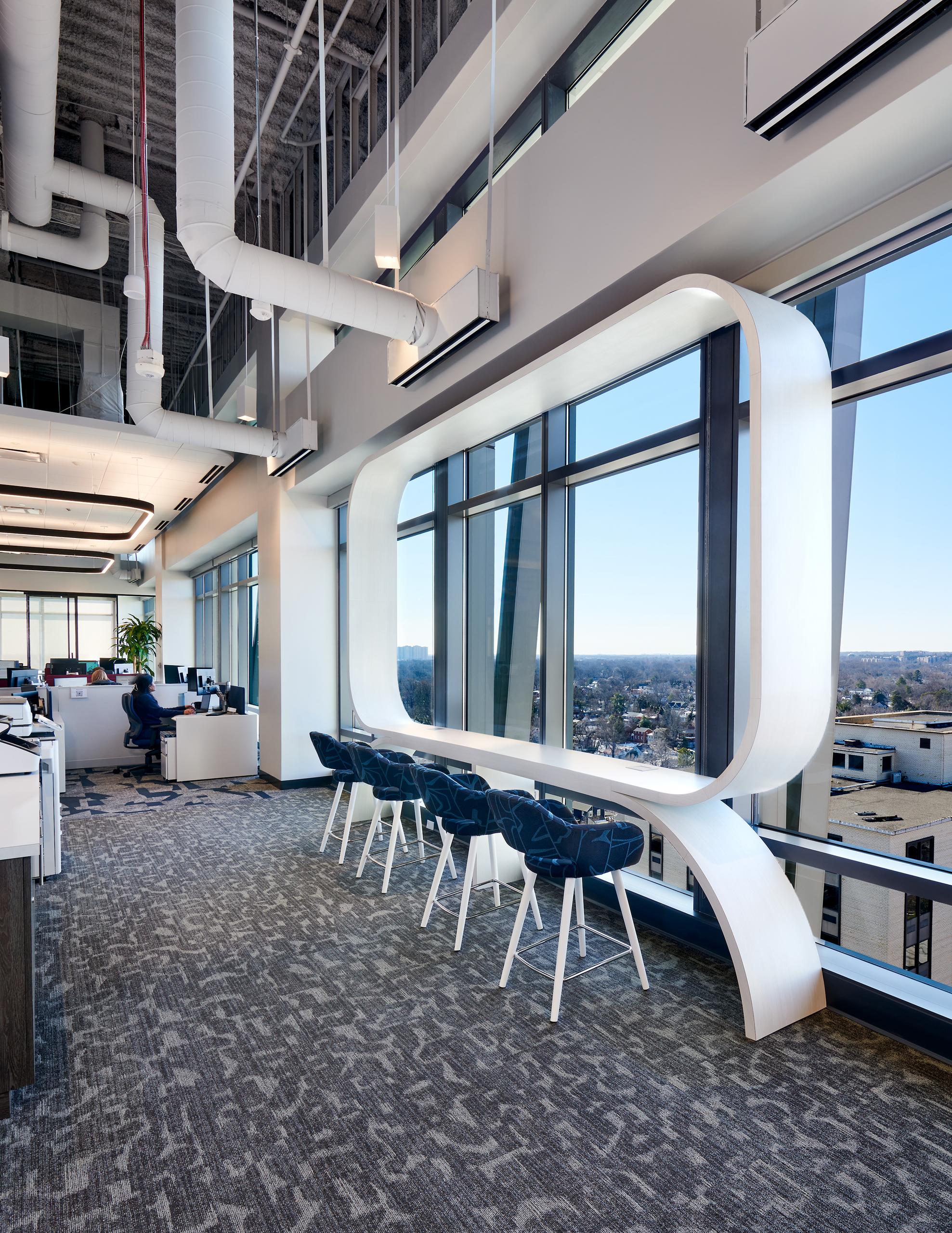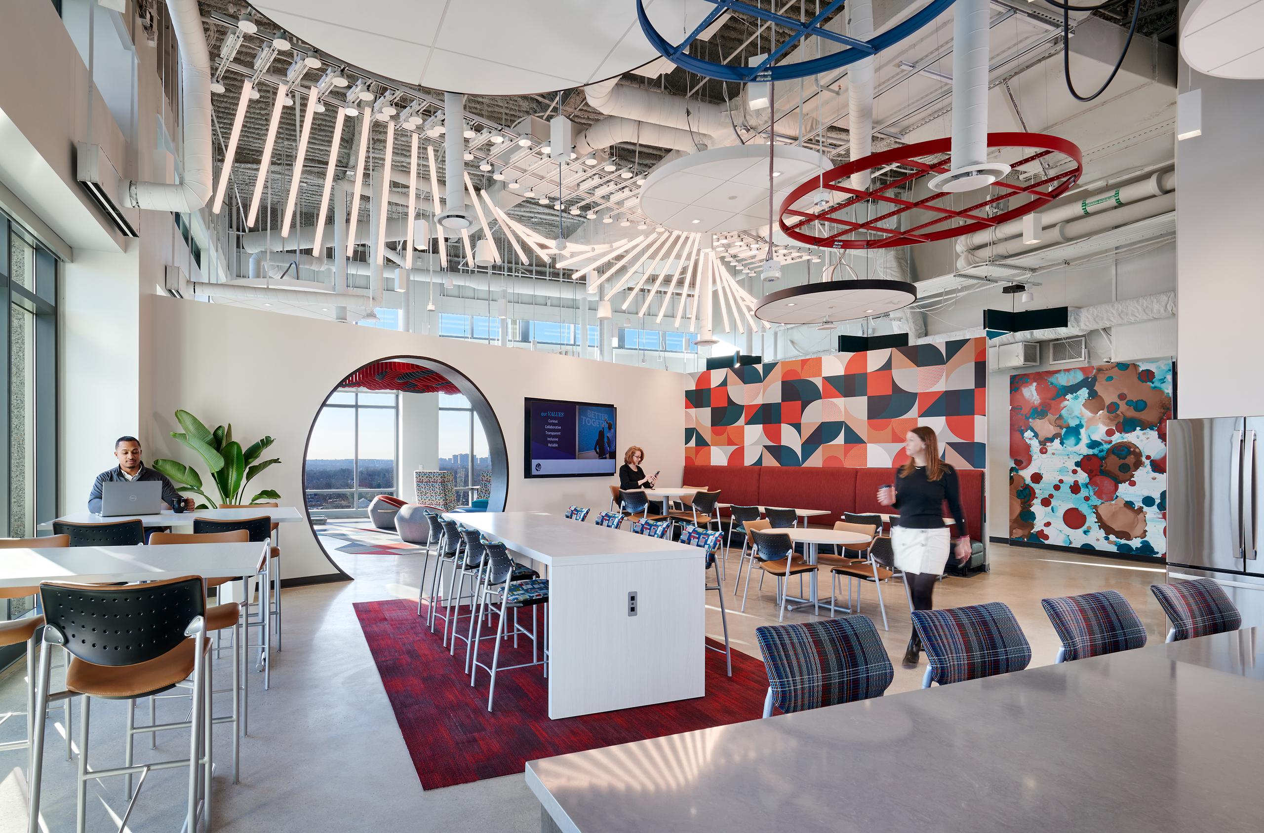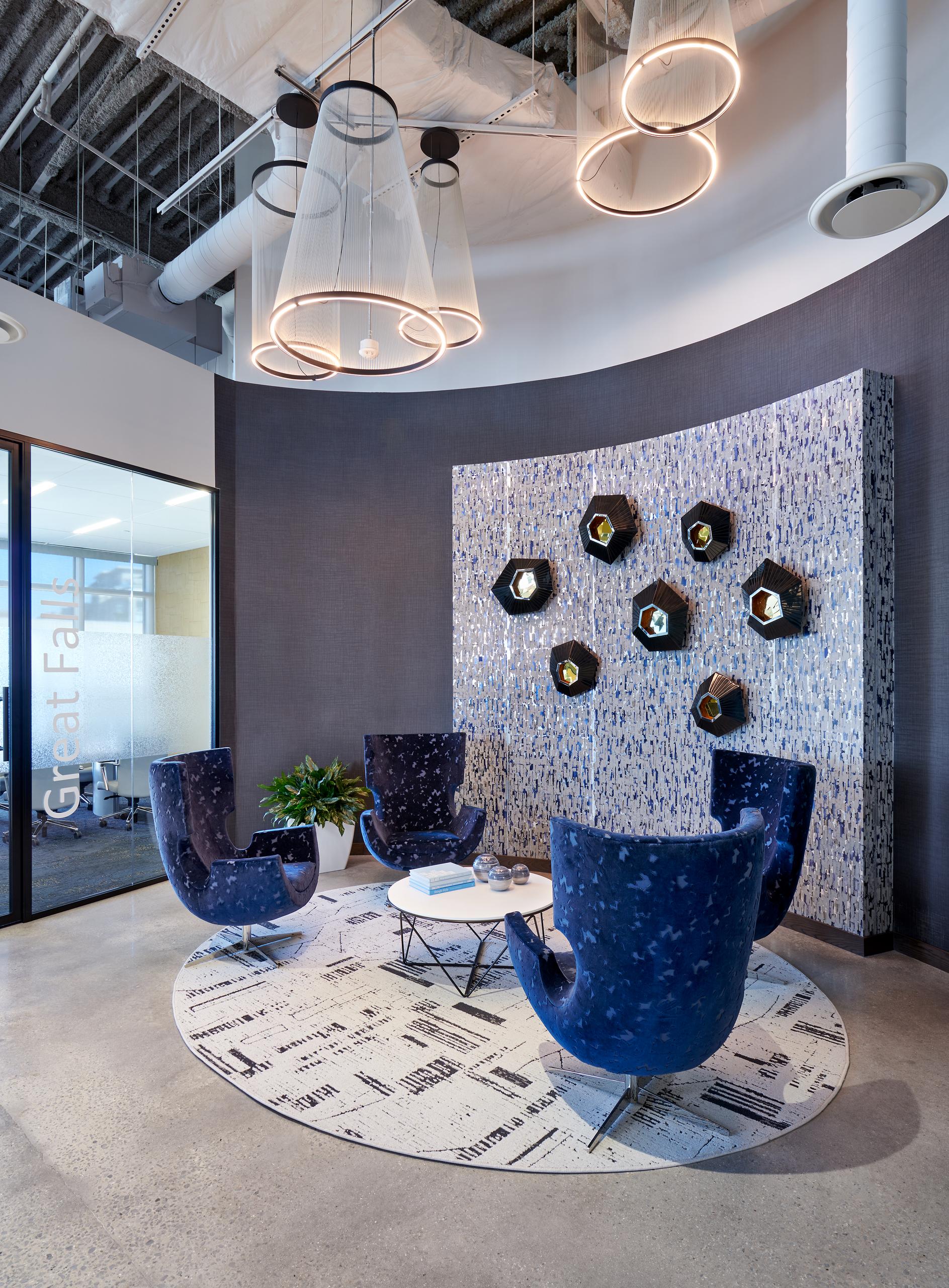 The expansive break room serves numerous functions by providing opportunities for large team gatherings, socialization, and respite. The standout “Thrive Area” encourages movement and engagement with treadmill workstations, flexible seating, and sound-absorbing felt ceilings. Movable, sound-dampening Pods provide a space for focused work and private meeting spaces, ensuring a balanced and productive work environment. The diverse range of work settings, including private offices, meeting rooms, collaboration space, and focus areas, accommodates multiple modalities of working.