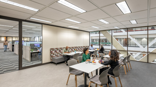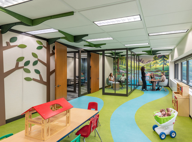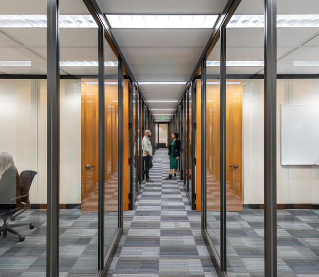In the Hennepin County Attorney's Office, meeting areas are used for individuals and families to meet with legal representation, learn about available services, and file orders, so privacy is of the utmost importance. Using demountable glass walls allows for soundproofing while maximizing natural light and connectivity. Wood doors add a sophisticated, modern touch to the space. The family room offers sectioned off areas for private meetings while the design transports families into nature with trees magnetized to the walls.
